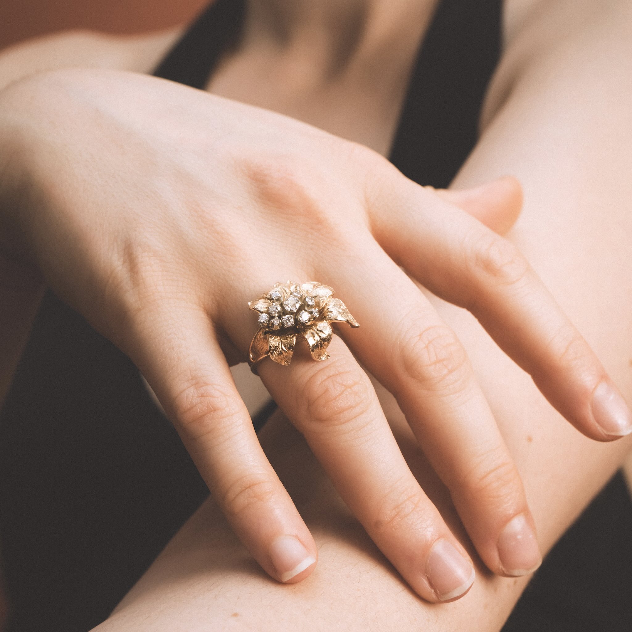 Bague très couture en forme de fleur en diamants des années 1950. Entièrement ciselée son mouvement asymétrique se place parfaitement sur la main. Son poids est de 10,8 grammes