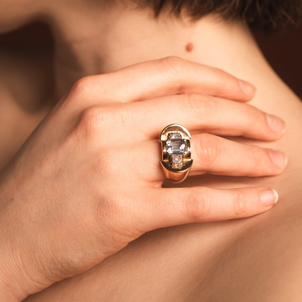 Le nom « bague Tank » s’impose naturellement en raison de l’inspiration visuelle de l’époque. Les lignes massives et mécaniques des chars d’assaut marquent durablement les esprits, et cette influence se retrouve dans la morphologie même de ces bijoux. Les formes en rouleaux évoquent les chenilles, les pans droits rappellent les blindages, et les volumes empilés imitent la superposition de plaques métalliques. La bague Tank traduit ainsi une esthétique de robustesse et de stabilité, directement issue du langage industriel et militaire du milieu du XXᵉ siècle. Elle s’éloigne des lignes souples et naturalistes des décennies précédentes pour adopter une identité franche, architecturale, presque mécanique.
