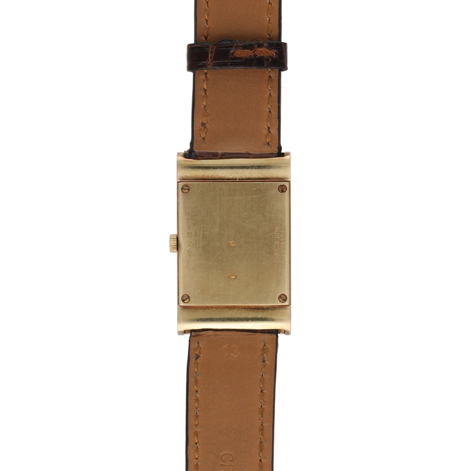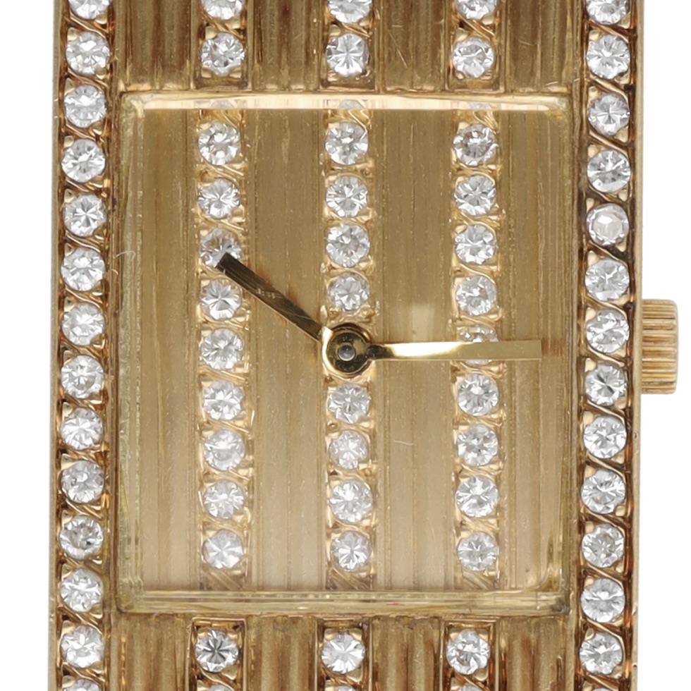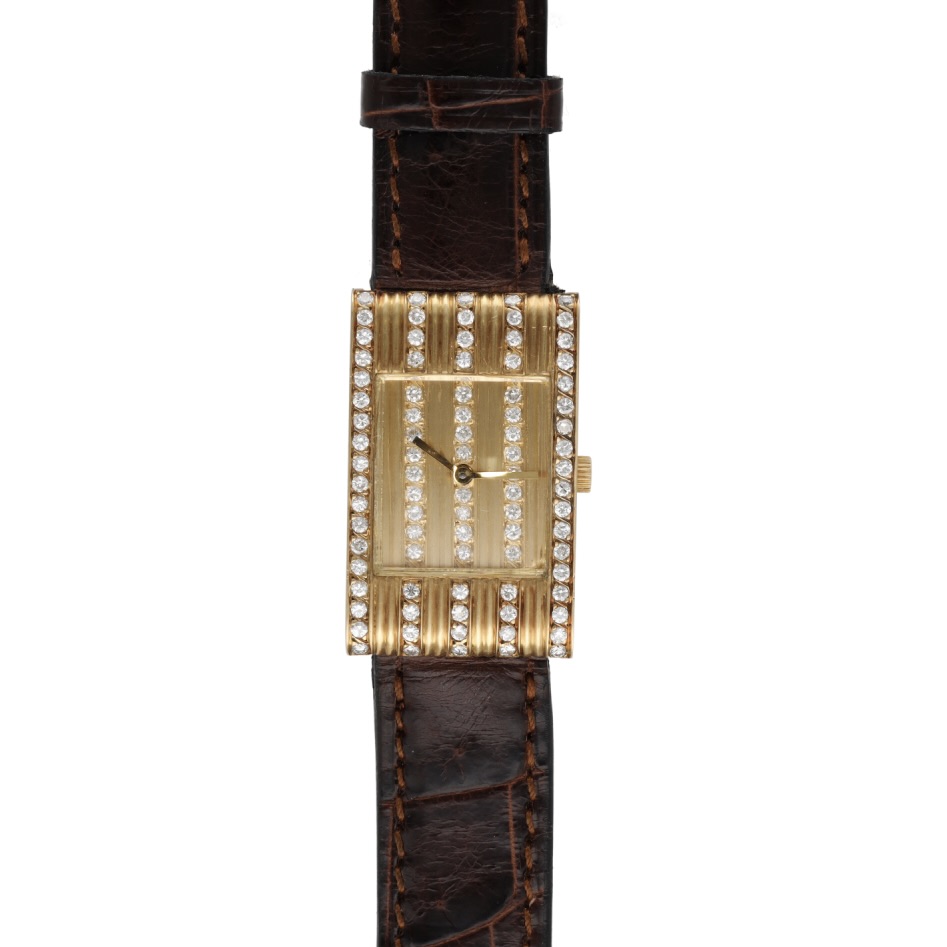 Montre Boucheron Reflet réalisée en or jaune 18 carats, sertie de diamants pour un total d’environ 1 carat, dotée d’un boîtier de 27 × 17 mm pour une hauteur de 4,84 mm, datée vers 1990. Montée sur bracelet avec boucle ardillon en plaqué, une montre-bijou iconique au design intemporel.